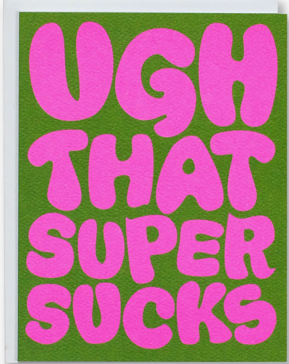 Ugh that super sucks. Sometimes, there's not much else that can be said. Electric fuschia hand drawn bubble letters on an olive green background. Offset printed on recycled paper in canada. blank card measures 4.25 x 5.5 inches and includes A2 envelope.