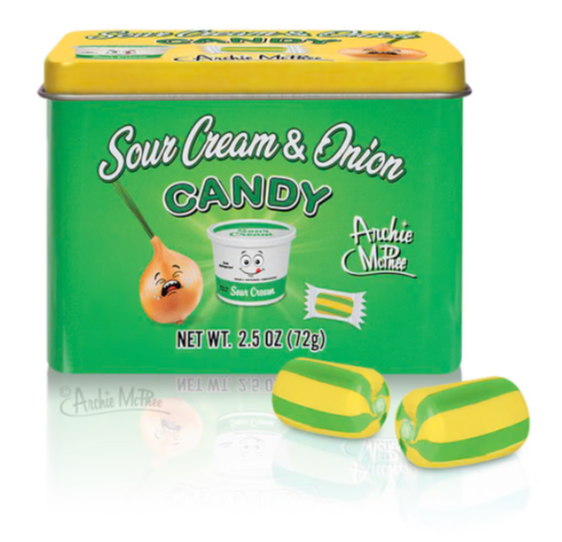 ALL THE DIP AND NONE OF THE CHIPDo potato chip flavors translate into candy? This tin of Sour Cream & Onion Candy answers that question with a resounding yuck! These green and yellow striped candies taste exactly like sour cream and onion dip. Set these out during the big game as a surprise for your friends! It’s a 3-1/4" x 2-1/2" x 2" tin filled with 2.5 oz. of individually wrapped sour cream and onion-flavored candy