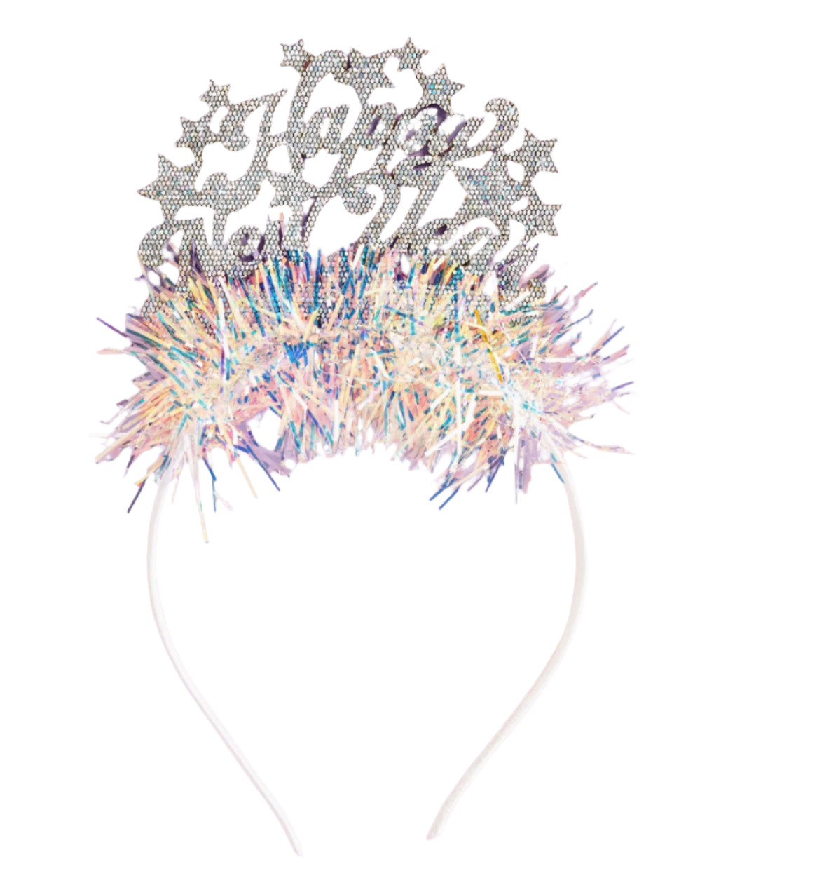 New year, new bad decisions Smile, there's champagne and our cute headband to celebrate this new year! We always say "less bitter, more glitter" and this headband is serving just that. Whether you're staying in this NYE or raising your glass at your favorite venue - our headband is the accessory you need to ring in the new you. Happy New Year logo featuring glitter fabric + iridescent fringe Headband measures: 4.5" wide and 9" tall One size fits all!