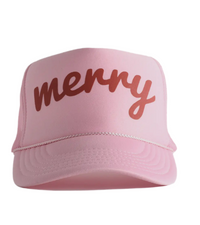Details: * pink foam front, mesh back and bill. * Hat reads "merry" in brick red font - screen printed ink transfer (not vinyl). * One size fits most. Snap back closure with 7 adjustable holes. * 5 panel cap, high rise. * 100% foam panel front. * 100% polyester mesh back.