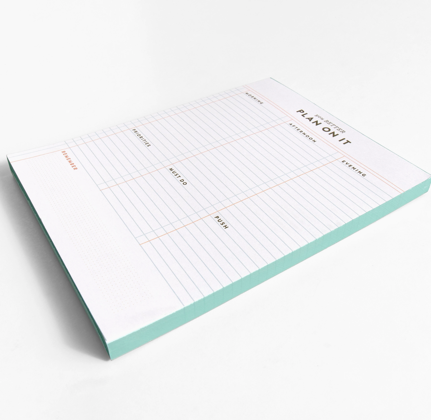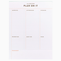Conquer your day with the Plan On It Notepad—your daily dashboard for getting things done. This 6x8” notepad features 75 sheets designed to break down your schedule by morning, afternoon, and evening, plus sections for priorities, must-dos, and those tasks you’ll probably push to tomorrow. A dot grid “Remember” box at the bottom is perfect for notes, doodles, or last-minute thoughts. With a clean layout and soothing color-blocked edge, this notepad makes organizing feel a little more effortless. Great for students, professionals, and anyone with a busy brain. Makes a thoughtful gift for planners and go-getters alike. Features: 75 sheets with aqua gilded edges Size: 6×8"