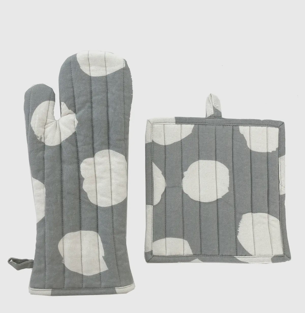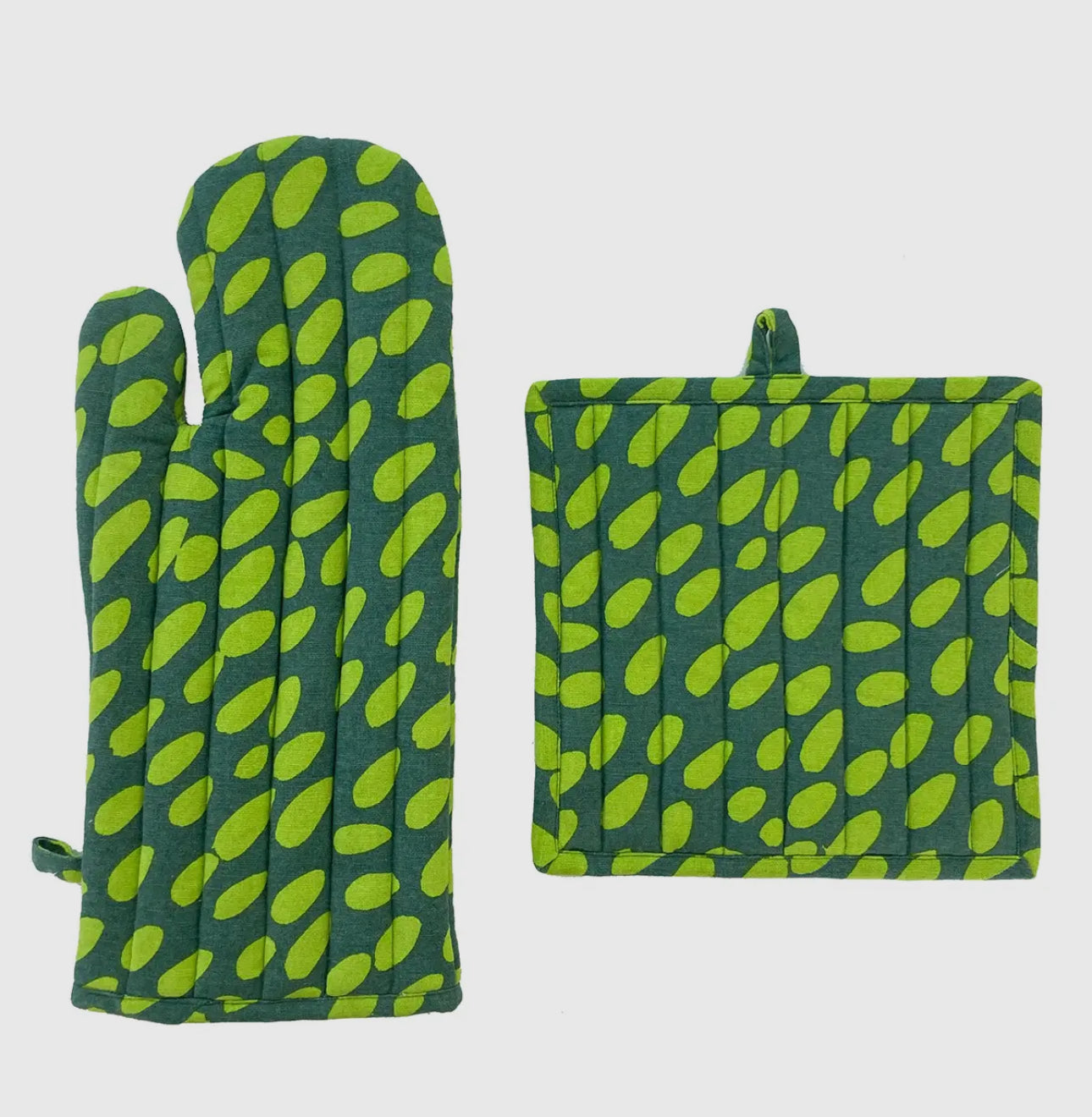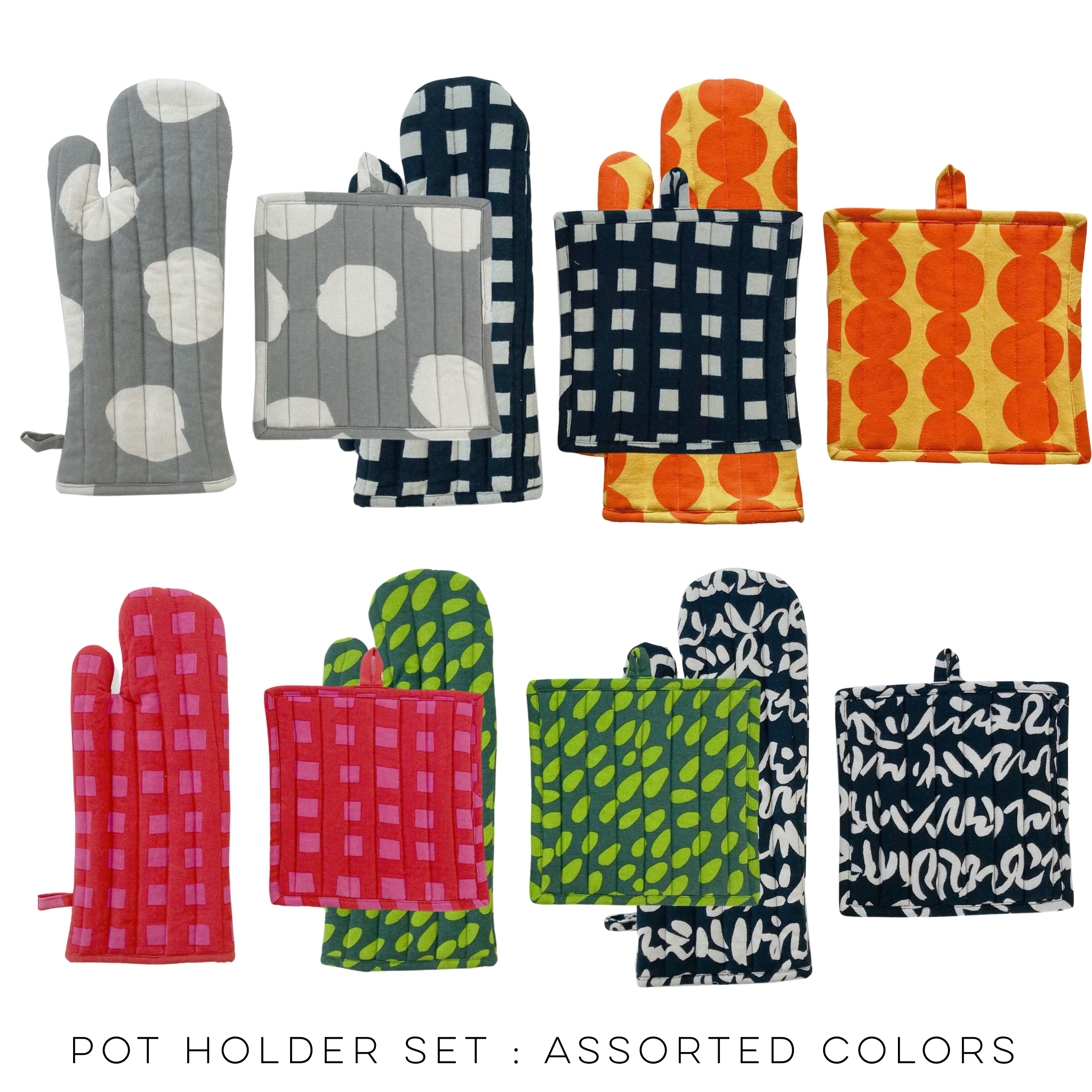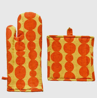 These oven mitt and potholder sets feature the fresh, hand painted designs by Donna Gorman. The oven mitt is extra-long (14" x 6") by design to protect your arms when cooking & baking. The potholder measures 8.25" x 8.25". The set comes with one oven mitt and one potholder. Both are channel quilted from 100% cotton fabric with polyester wadding.